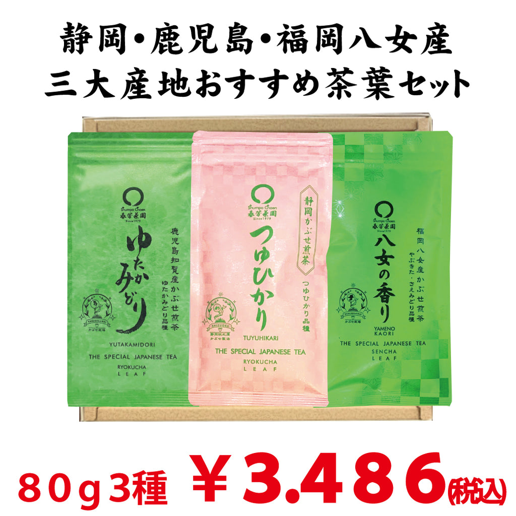 春芳茶園では毎年、全国の茶産地を巡り、静岡掛川産、菊川産の味の濃い深蒸し緑茶、鹿児島知覧産、大根占産の高品質なかぶせ製法の鹿児島かぶせ煎茶、福岡八女産の香りの良い厳選茶葉を使用した八女かぶせ煎茶をお届けしております。