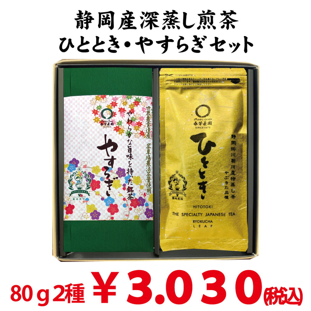 旨味濃い上級煎茶「やすらぎ」と、春芳人気NO.1の「煎茶ひととき」の静岡産深蒸し煎茶セットです。やぶきた品種の旨味の濃さにまろやかな甘みを感じるセットとなっております。旨味濃いお茶が好きなお客様に贈るのがおすすめです。